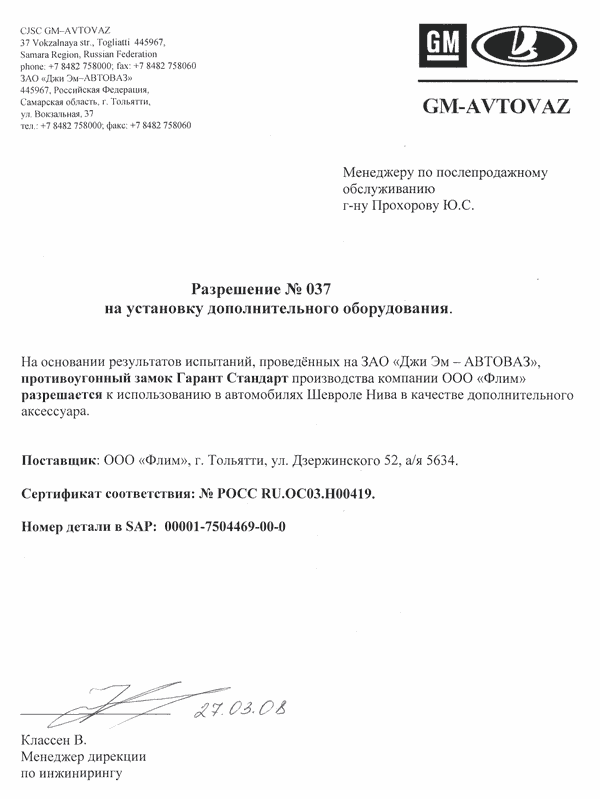 на использование замка "Гарант-Блок" на автомобилях семейства "Lada Kalina" (2007)
